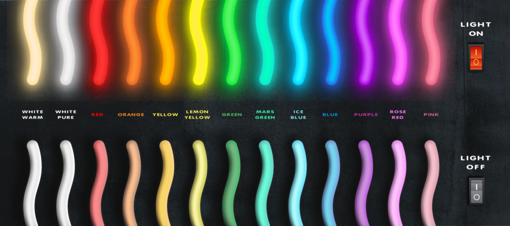 The LED neon we use in our signs is made of two key components: an LED strip and a flexible silicone tube. The strip produces the light, while the silicone tube serves two important purposes — it protects the LEDs from damage and diffuses the light, creating a smooth, continuous glow. Our LED neon sign can be made using two types of flexible tubing: white or colored. Each option offers a different visual effect depending on your needs.